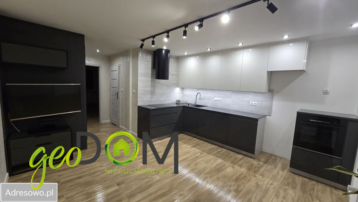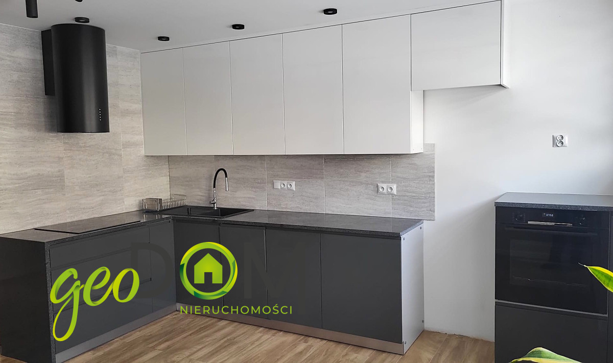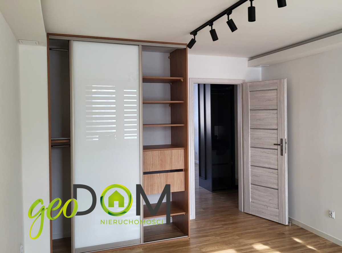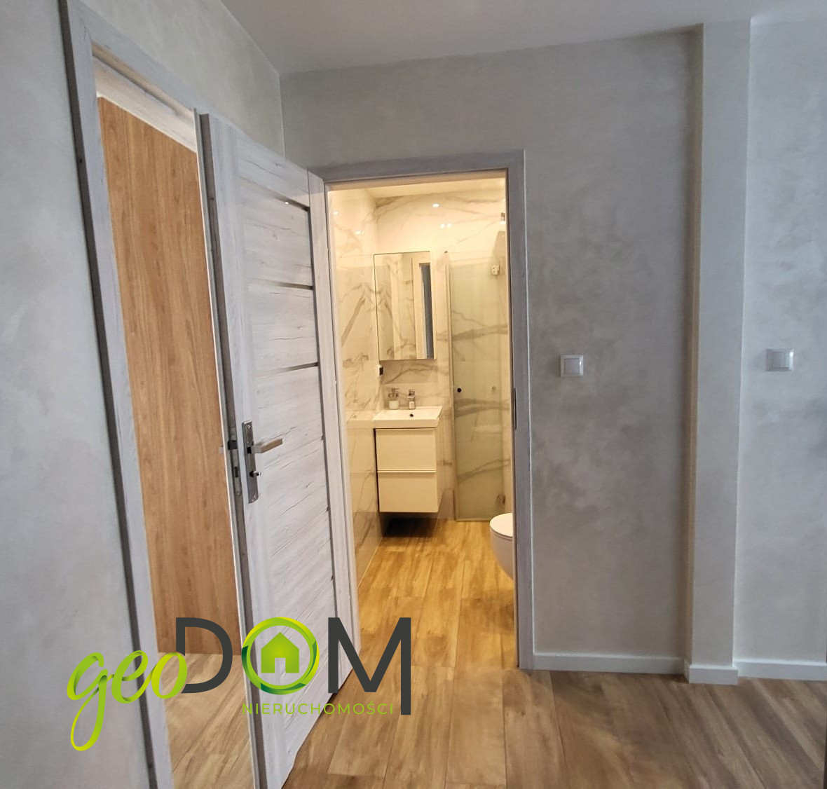 Szafa w zabudowie. Łazienka - kamień w stylu marmuru, szklana kabina typu walk-in, deszczownica. Całość tworzy spójne, nowoczesne wnętrze — gotowe do zamieszkania od razu.